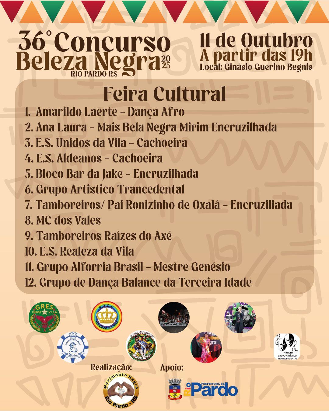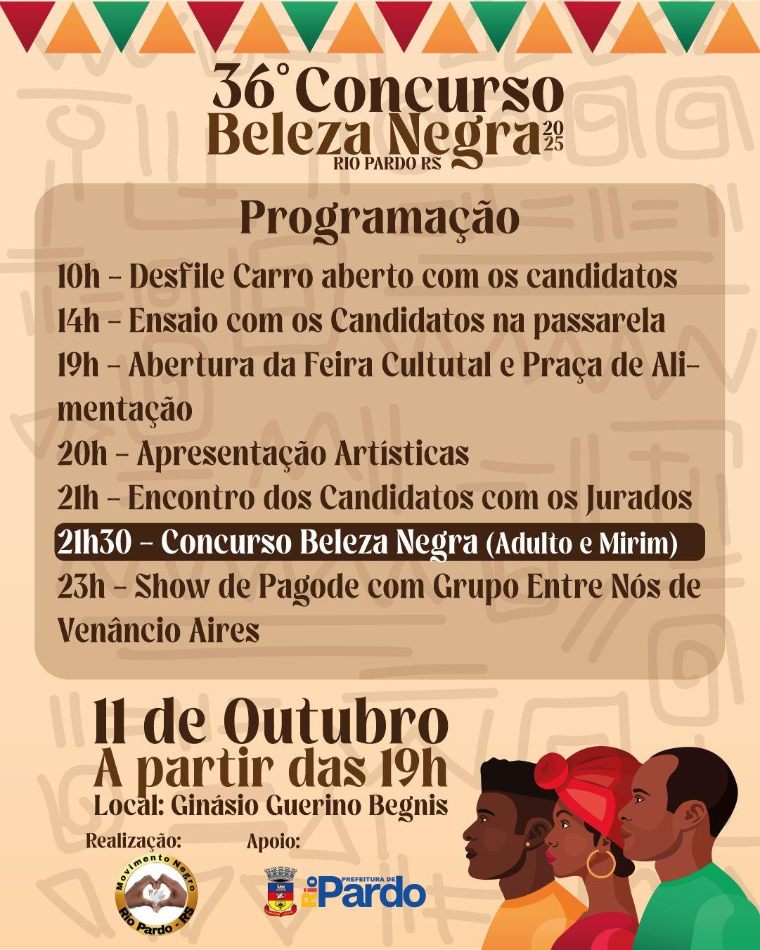 No próximo dia 11 de outubro, a cidade de Rio Pardo será palco do 36º Concurso Beleza Negra, que acontece a partir das 19h no Ginásio Guerino Begnis. O evento, realizado pelo Movimento Negro de Rio Pardo com apoio da Prefeitura Municipal, reunirá atividades culturais, concurso e atrações musicais.