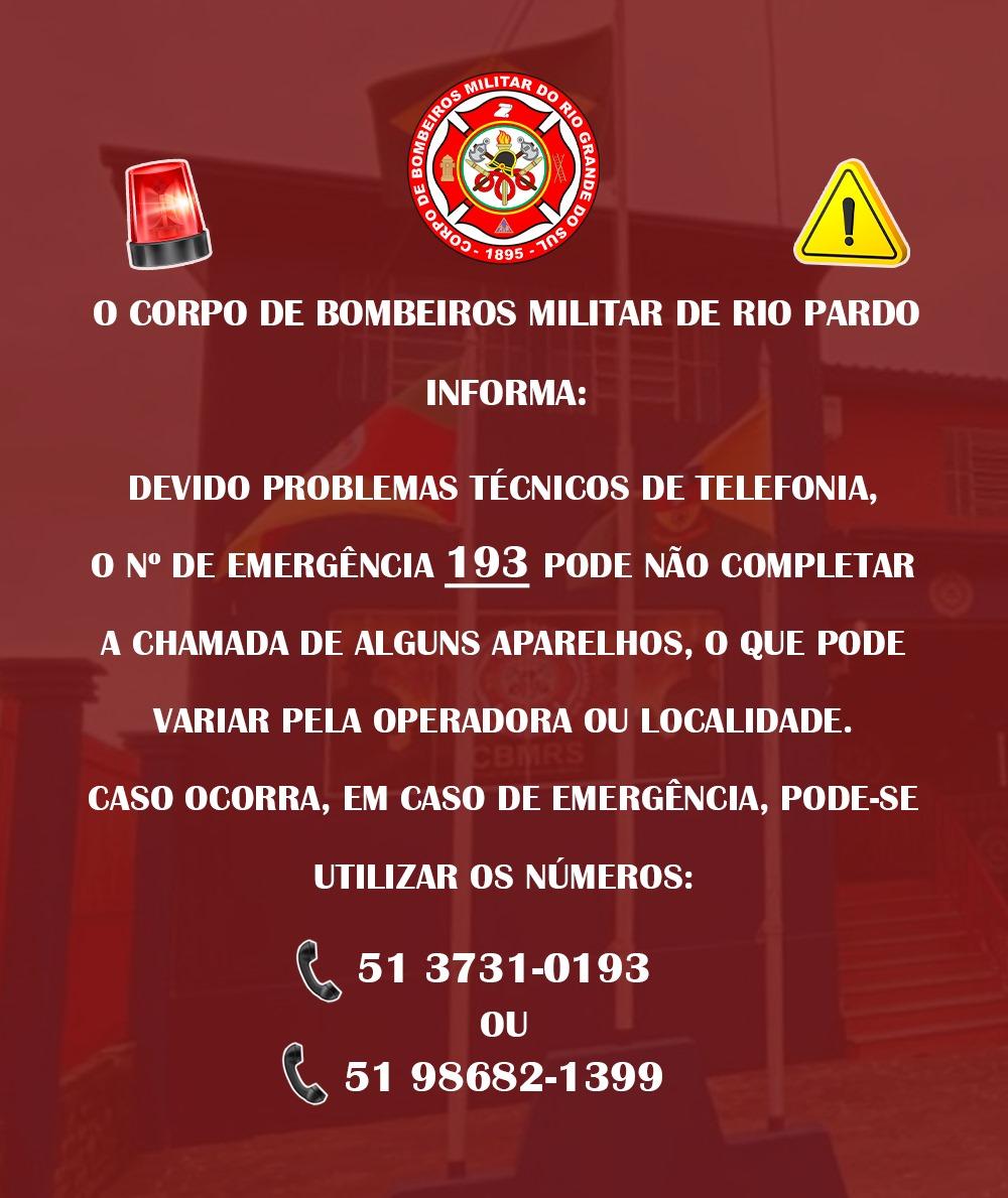O Corpo de Bombeiros de Rio Pardo colocou dois novos números de contato à disposição da comunidade. A medida visa dar alternativas às pessoas que não conseguem completar a ligação no "193". Confira o comunicado dos Bombeiros.